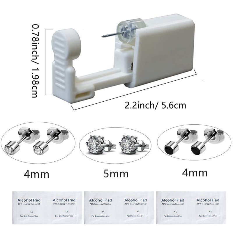 - 【Ear Piercing Kit】 Each package contains 6 pack ear piercing gun, 2 Black(4mm)+2 White(4mm)+2 Silver(5mm) Stud Earrings (Built-in piercing gun) and 6 cleaning cotton pads