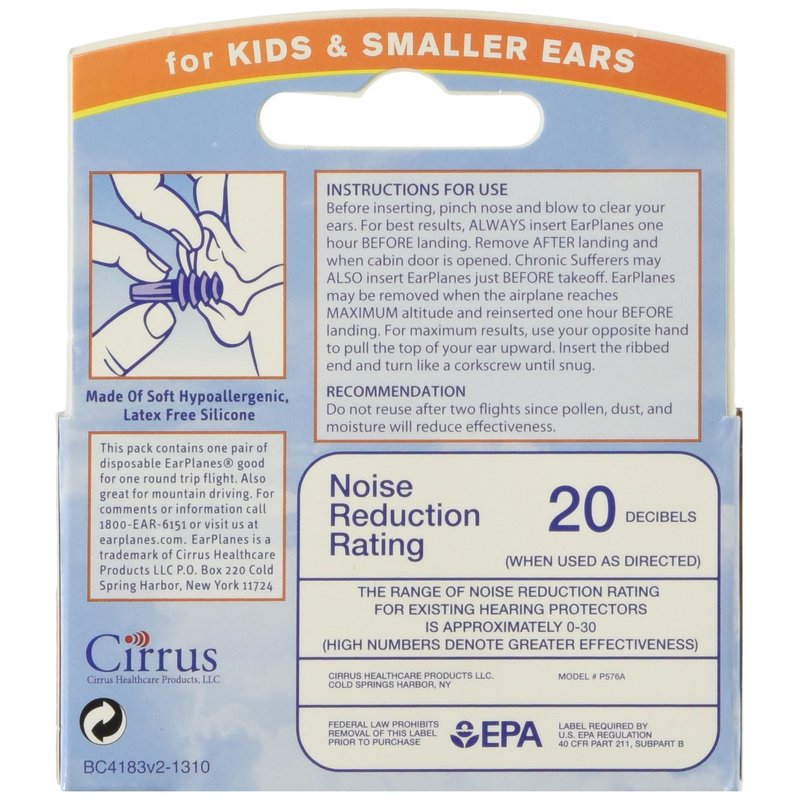 Put an end to airplane ear pain! For little flyers, takeoffs and landings often result in ear pain and popping. That's because rapid changes in cabin pressure don't allow the ear's Eustachian tubes time to adjust. Next time, use doctor-recommended EarPlanes. Insert them in your child's ears, and these soft, hypoallergenic filters regulate changing air pressure, eliminating discomfort while reducing noise. Tested by U.S. Navy pilots. One pair is effective for two flights. Choose Child (for ages 1-10) or Adult (ages 11 and up). You'll want a pair, too! Made of soft hypo-allergenic silicone.