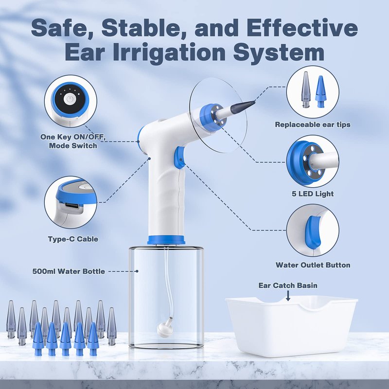 - 【Convenient & Effective】: The ear cleaning system has 4 different cleaning modes (Normal, Soft, Pulse, Power) to meet your different needs. 5 LED lights illuminate the ear canal, and the transparent baffle prevents water splashes. Easily remove accumulated earwax from the comfort of your own home.