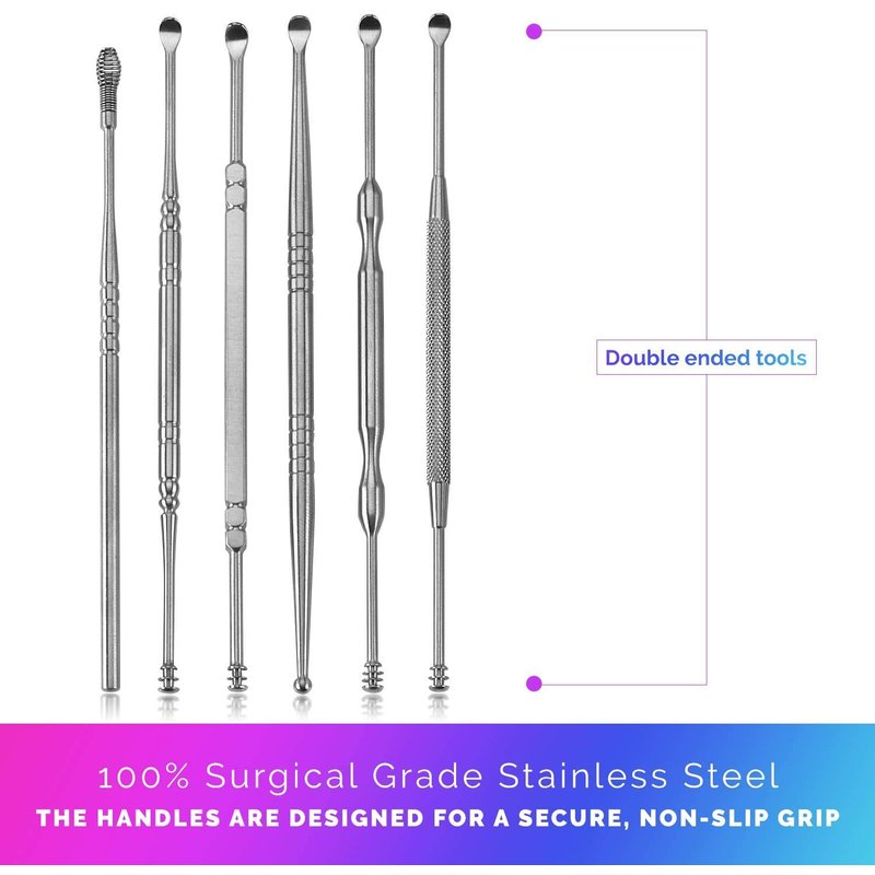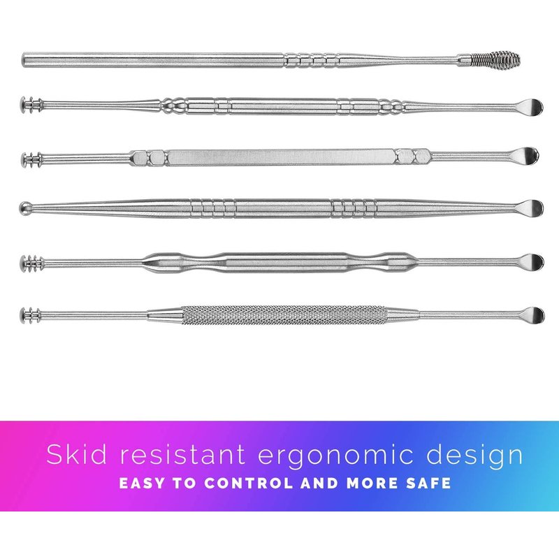 - ★ERGONOMIC NON-SLIP DESIGN: The problem with other ear wax removal kits is that they irritate your ears rather than cleaning them. Our earwax removal kit solves that problem! Why? That's because our ear wax removal kits were made with ergonomic and skid resistant designs, stainless steel and are rounded to prevent irritation and scratching. Now you can clean your ears without the worry of irritation or pain.