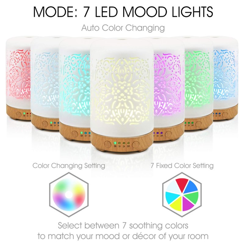 - Cool Mist Humidifier advanced ultrasonic diffuser with 4 timers, this beautiful decorative piece runs steady and quiet. It’s the best experience for you and your family.