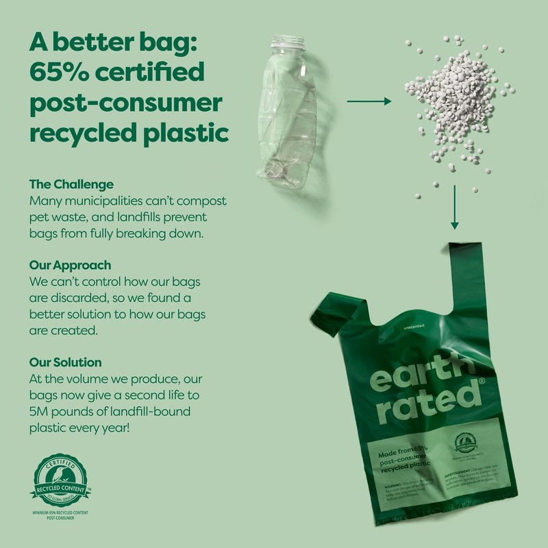 - BETTER BAGS : A new generation of high quality & durable dog poop bags made from 65% certified post-consumer recycled plastic. Giving a second life to over 5 million pounds of landfill-bound plastic a year.