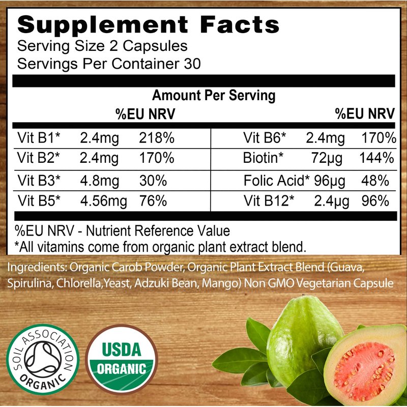 Certified Organic B Vitamins made exclusively from plants. Does not contain any fillers, binders or additives.