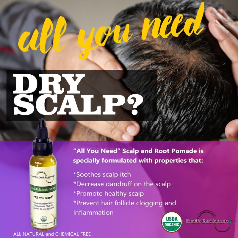 Our Dry Scalp Serum contains “All You Need” for a healthy scalp. Combining the best organic essential oils, this dry scalp treatment is a light moisturizer and is effective on all hair and skin types. Handmade with properties that combat product build-up, this serum also helps prevent dandruff and itchy, flaky scalps. It soothes the skin and reduces irritation. This dry scalp oil is a leave-in ointment and can be used as a spot treatment or over your entire scalp.