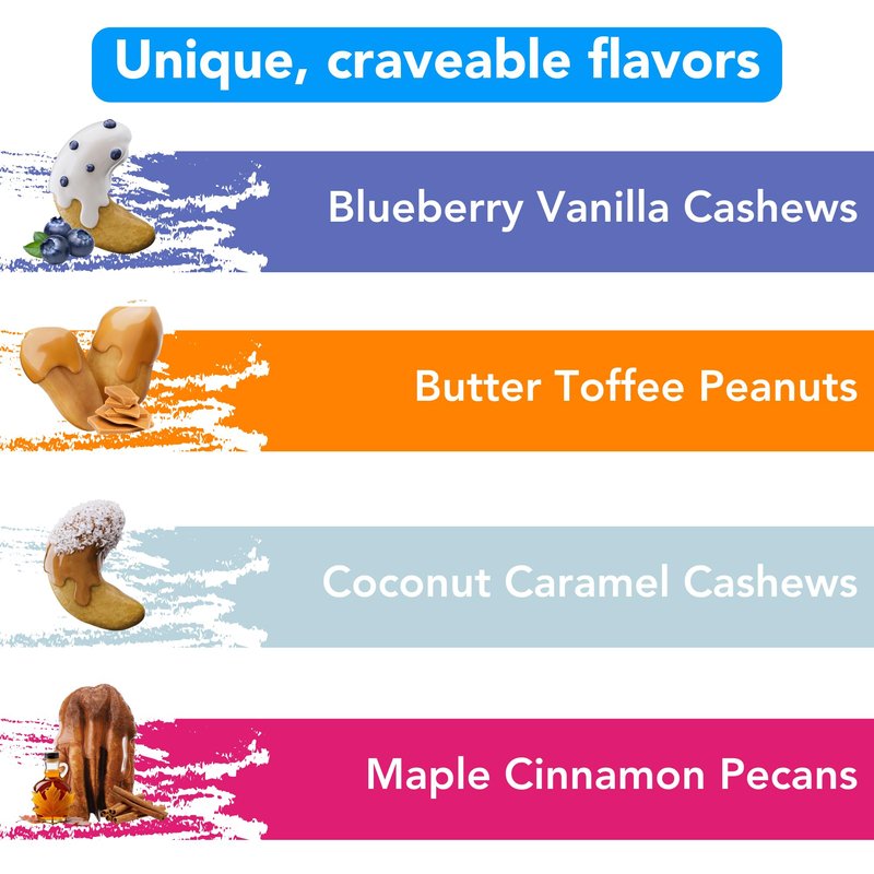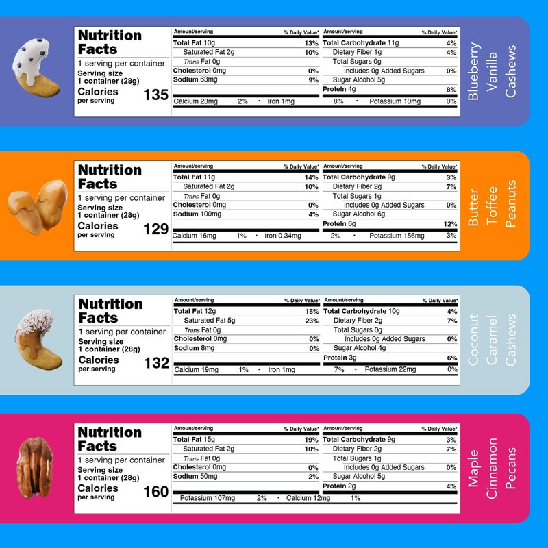 - ✓ 4 FLAVORS variety nuts snack packs. Craving a sweet snack? Try all 4 sinfully delicious trail mix packs of pecans, cashews and peanuts, in our protein train mix variety of Blueberry Vanilla Cashews, Maple Candied Pecans, Butter Toffee Peanuts, Coconut Caramel Cashews