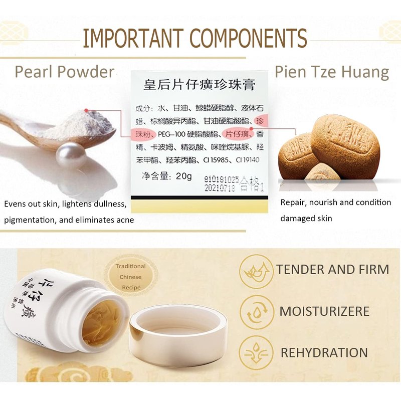 - ღ Pearl Care Cream Moisturizing Face Cream: A smooth, creamy daily face moisturizer infused with hydrolyzed pearl, Pientzehuang, and glycerin. Ancient heirloom formula, perfectly fused with several kinds of plant essence and hydrolyzed pearl, locks water and moisturizes, nourishes skin, improves rough skin, tightens skin, and evens skin tone. This face moisturizer helps renew skin for a beautiful glow.