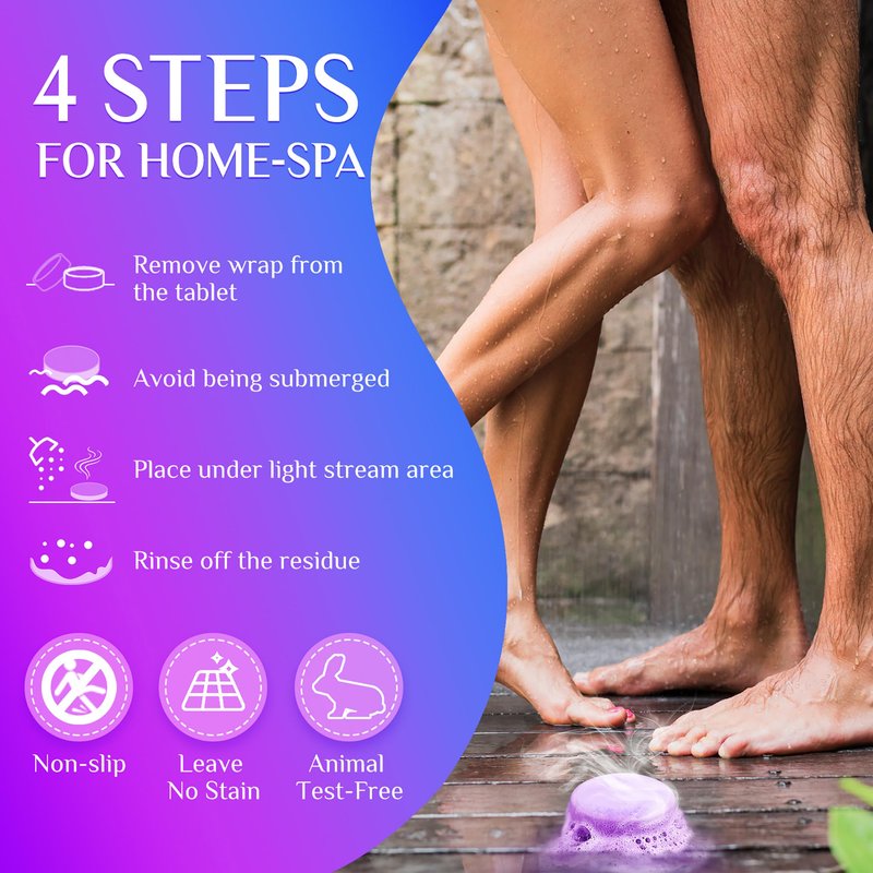 - A Deluxe Home Spa-----Pick the tablet scent you like and place in the corner of your shower & do not submerge it. The shower bomb will gradually release its aroma, enveloping your entire body with a captivating scent, breathing slowly & deeply to enjoy the moment of intoxicating home spa treatment.