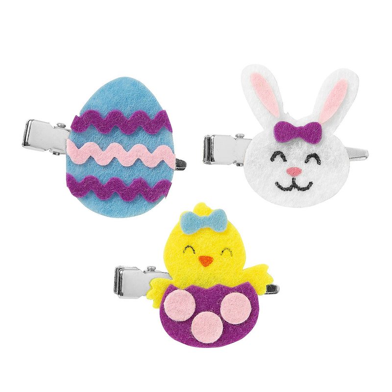 - These adorable bunny, chick and egg hair clips are a fun activity to get kids excited for Easter, to do on Easter morning while they’re waiting for the egg hunt to start, or as a party favor to keep them busy while the adults are talking at brunch. Includes metal hair clips and felt pieces. 1 1/2" x 1 1/2" Makes 12. All craft kit pieces are pre-packaged for individual use. Kits include instructions. Some glue required, sold separately.