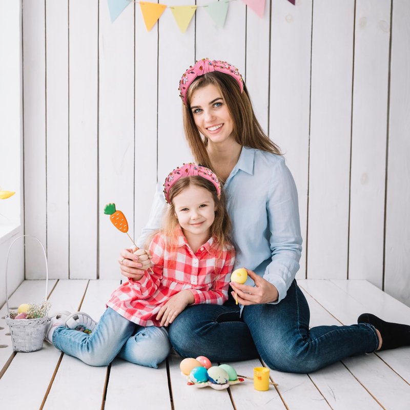 These white pink headbands feature wide top knot design and super cute Easter bunny/egg with bead details, accent with sparkle baroque crystal in vibrant Spring color and elegant pearls, perfect for the upcoming Easter Holiday, whether you're going to church or having an Easter egg hunt.