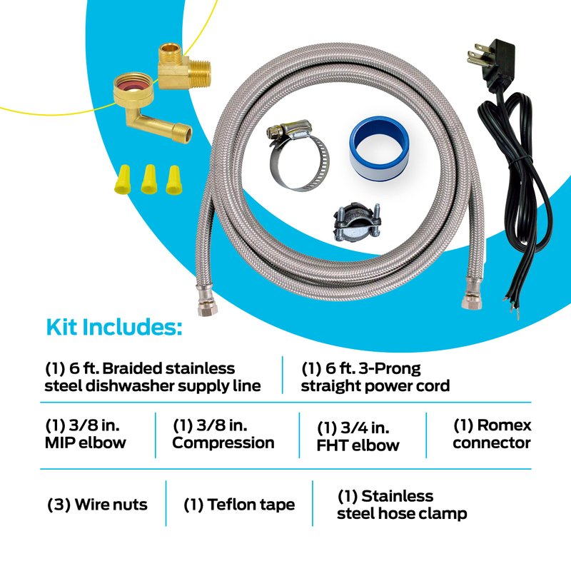 - WHAT IS INCLUDED: (1) 6 ft. dishwasher supply line with a 3/8 in. compression on each end, (1) 3/4 in. FHT 90-degree elbow, (1) 3/8 in. MIP 90-degree elbow, (1) 6 ft. 3-prong straight power cord, (3) wire nuts, (1) Teflon tape, (1) stainless steel hose clamp, and (1) Romex connector