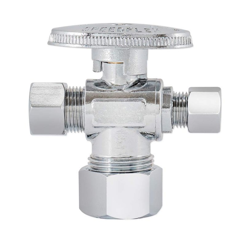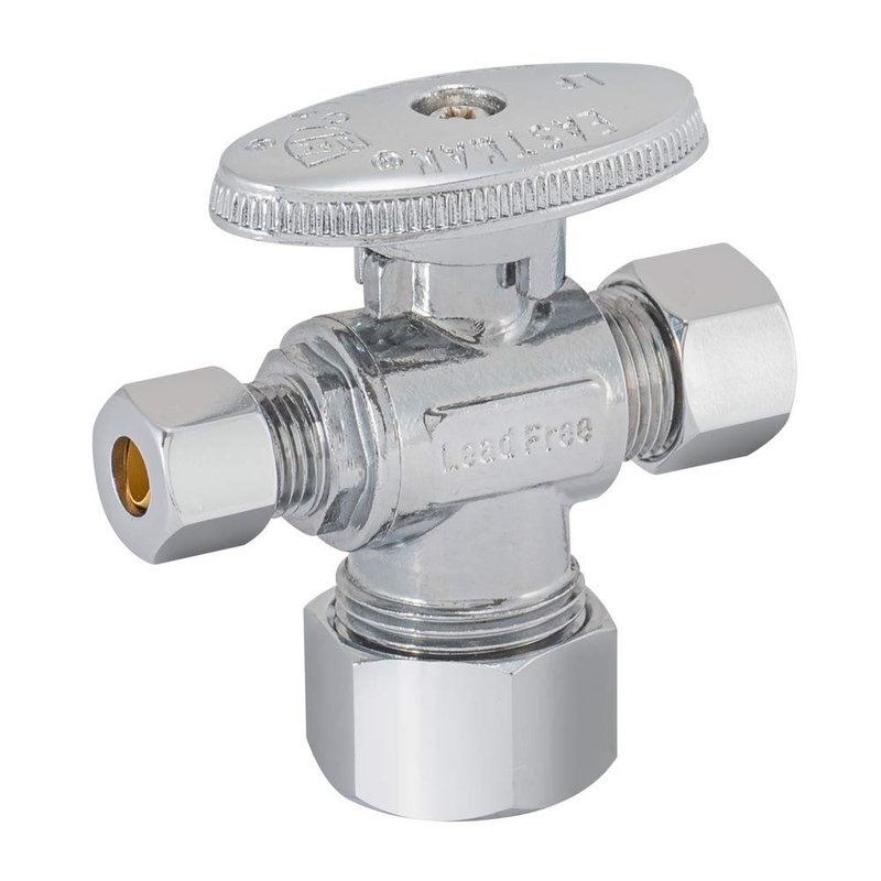Eastman Quarter-Turn Dual Outlet 3-Way Stop Valve, 3/8 Inch OD Compression x 1/4 Inch OD Compression x 5/8 Inch OD Compression, Chrome Plated, 48654LF
