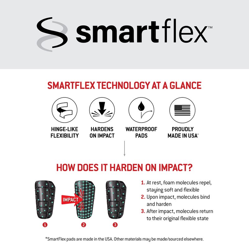 - TRI-LAYER PROTECTION | [1] Firm and flexible TPU exo-skeleton [2] SmartFlex pad which is flexible during play and hardens on impact [3] Foam layer for increased comfort