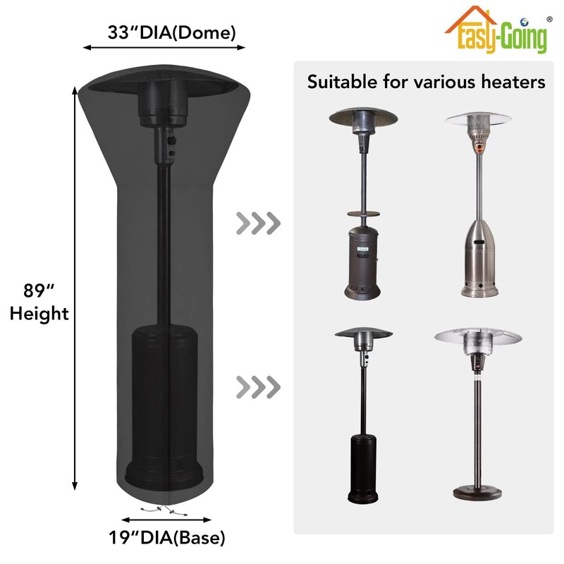 - Item Dimension: The heater cover size is 89"H x 33"DIA(Dome) x 19DIA(Base). It fits most pro-pane patio heaters. Please measure your patio heater before purchasing.