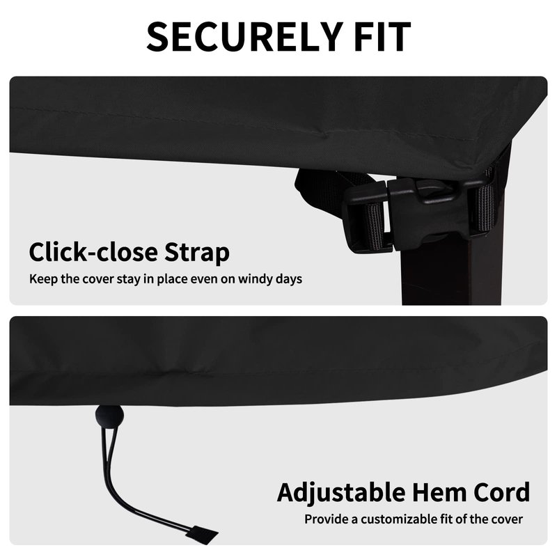 - Easy to Use: Two wide padded handles make it easier to fit and remove. Click close-straps around furniture leg can prevent the cover from being blown off on windy days. Elastic hem cord with toggle allows for a tight and custom-like fit.
