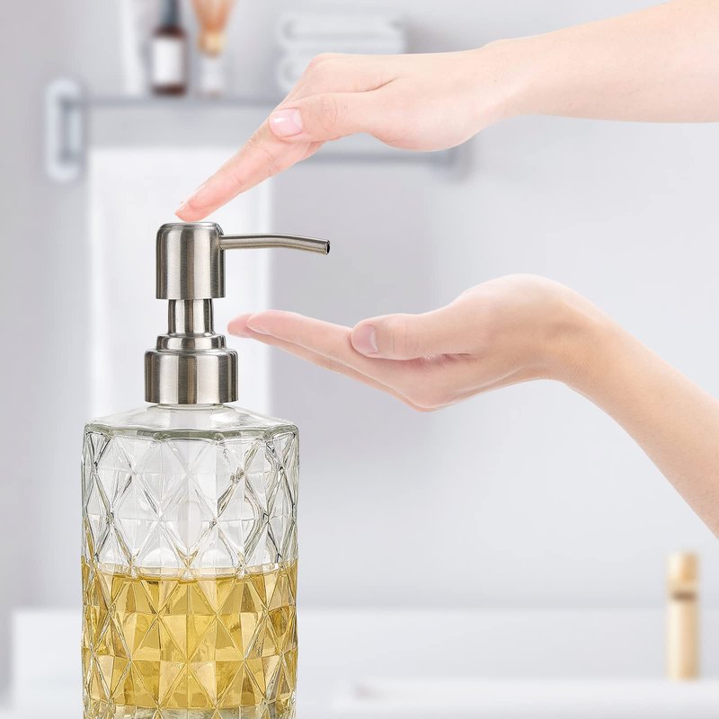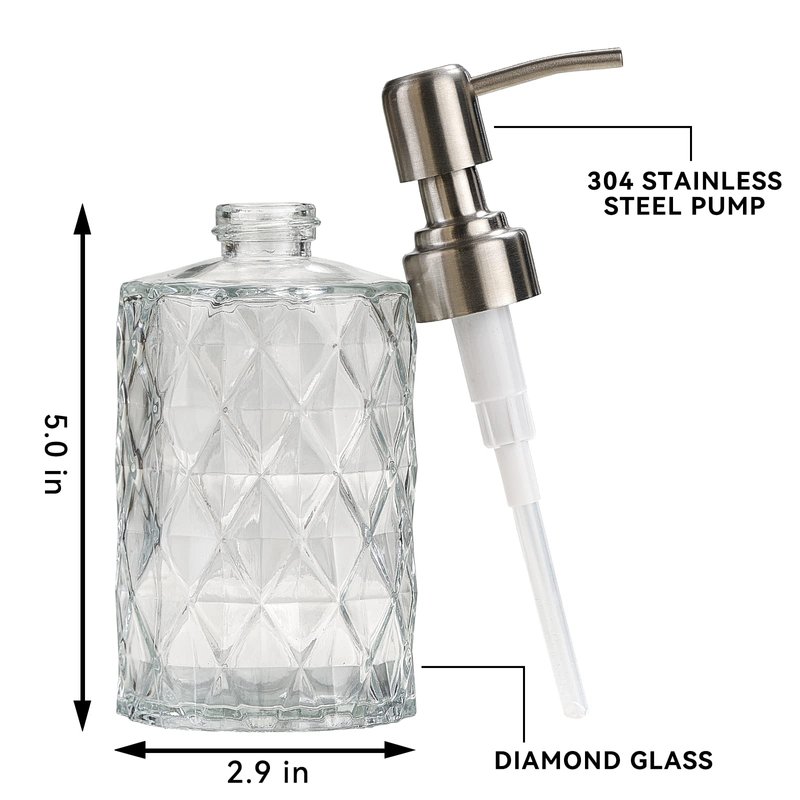 Pump Material - 304 Stainless Steel Bottle Material - Clear Glass Capacity - 12 oz Dimensions - 6.89 inches (Height), 2.95 inches (Width) This dispenser bottle is by all high-temperature thick glass firing, new manufacturing technology, product molding process is excellent. Stable product quality, small capacity deviation, high cleanliness and homogeneity. Instructions: Our designing theory is fresh and elegant in style quaint and natural in fashion, itâ€s splendid in the light. The bottom has anti-skid thread, uniform and strong appearance. It's made of environment-friendly material, can directly contact the liquid without chemical reaction with the liquid. No need to worry about the influence of heavy metals on the liquid quality. High visibility, non-slip safety, colorfast, watertight, perfectly sealed, good resistance to pressure. Small, light and super convenient filling. Gently press its pump, easy to control the amount of the liquid, not easy spilling, waste nothing. Four colors are available, ranging from nearly grey, green, amber and blue versions. Liquid varieties can be easily identified without labelling. Anti-corrosion, anti-deterioration, green environmental protection. Cleaning Method: Rinsed with warm water, disinfected with vinegar or alcohol. Some other better and more effective ways can be used as well. Attentions: This soap dispenser bump has no foaming function. Even though it is made of thick glass, sturdy and durable, it would be broken if you hit it hard or throw it to the ground. The bottle is not suitable for strong acid or alkali solutions, and don't fill with boiling water.