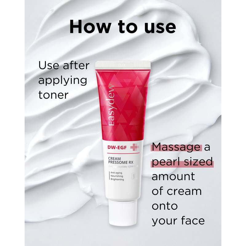 - EFFECTIVE APPLICATION METHOD: Maximize your skincare routine with DW-EGF Cream Pressome RX by applying a pearl-sized amount after cleansing and toning. Spread evenly across the face and gently press into the skin with your palms for optimal absorption and efficacy.