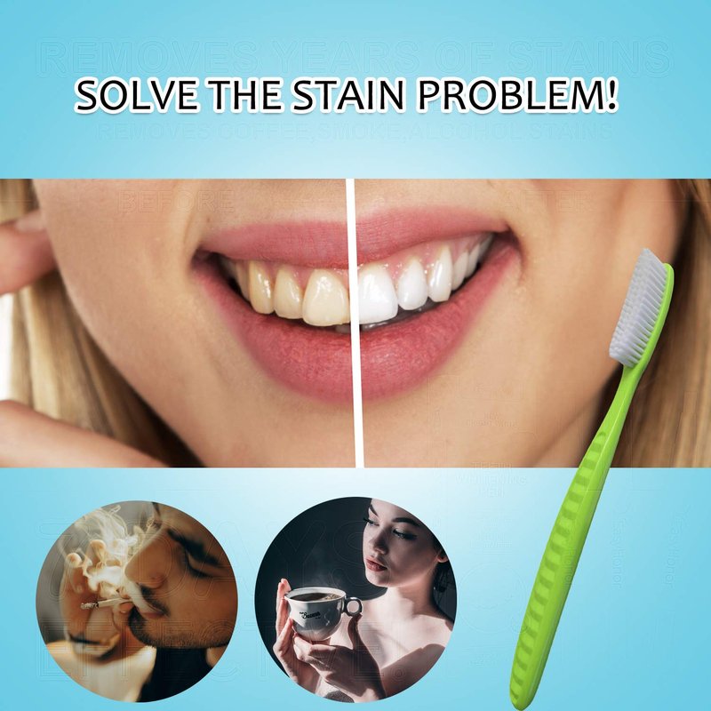 This toothbrush is a medium-hard toothbrush on the market, with a wire diameter of 0.18 mm, which is harder and more powerful than other ordinary soft toothbrushes (0.12 mm). It can effectively clean teeth and remove stains left by smoking and coffee. Note that he is not Extra-hard toothbrush, so under normal circumstances it will not harm the gums.