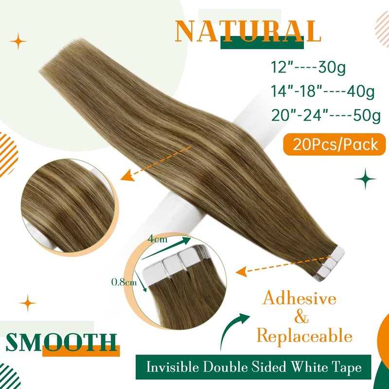 - 【Specification: Length & Weight】 Weight: 12” 30g, 14”-18” 40g, 20"-24" 50g, total 20 pieces. Thick Ends: Easyouth Tape in Hair Extensions is thicker at the ends, so if you have normal hair volume, about 1-3 packs can make a full head. Our uniquely delicate acid-free treatment process ensures the hair will remain healthy, glossy and in excellent condition throughout its life.