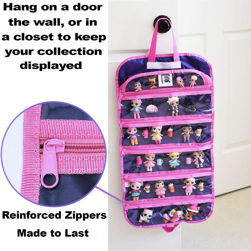 If your child has a Doll obsession, you know those little toys wind up EVERYWHERE! Other solutions may hold the characters, but the minute you open them they spill their contents.EASYVIEW Toy Organizer to the rescue!This handy organizer features 6 TRANSPARENT, ZIPPERED pouches that will keep your child's Doll accessories secure. What a great way for your son or daughter to show off their collection—plus they can find what they’re looking for without making a mess. Folds up compact for travel and includes a convenient handle to hang on the back of a door, wall or closet. No assembly required. Makes a fantastic birthday or Christmas gift for collectors & Doll -loving boys & girls!