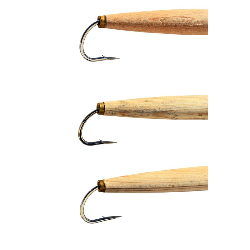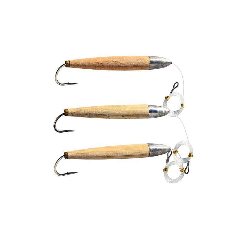 Fully rigged 3 pack of cedar plug saltwater lures. Wooden cedar plugs with a heavy lead bullet head with a 6'/200 lb. leader and a #8 hook in the tail. These plugs are 6" long and 1" across. These lures were made famous by the Japanese fishing fleet for Tuna. Fully rigged and fish ready! Retail: $72