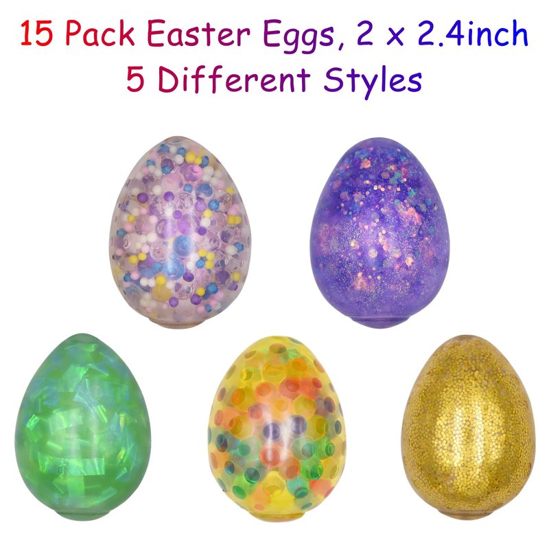 - Easter squeeze toys, Package includes: 15 pack easter stress balls squishy eggs (2 x 2.4inch), 5 styles of easter egg toys.