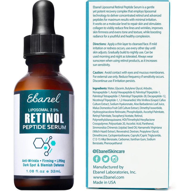 Ebanel Liposomal 2.5% Retinol Serum for Face with Hyaluronic Acid, Peptide, Vitamin C, Pore Minimizer Skin Tightening, Anti Aging Serum, Minimizes Wrinkles, Fine Lines, Age Spots