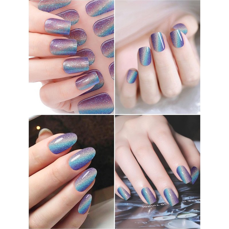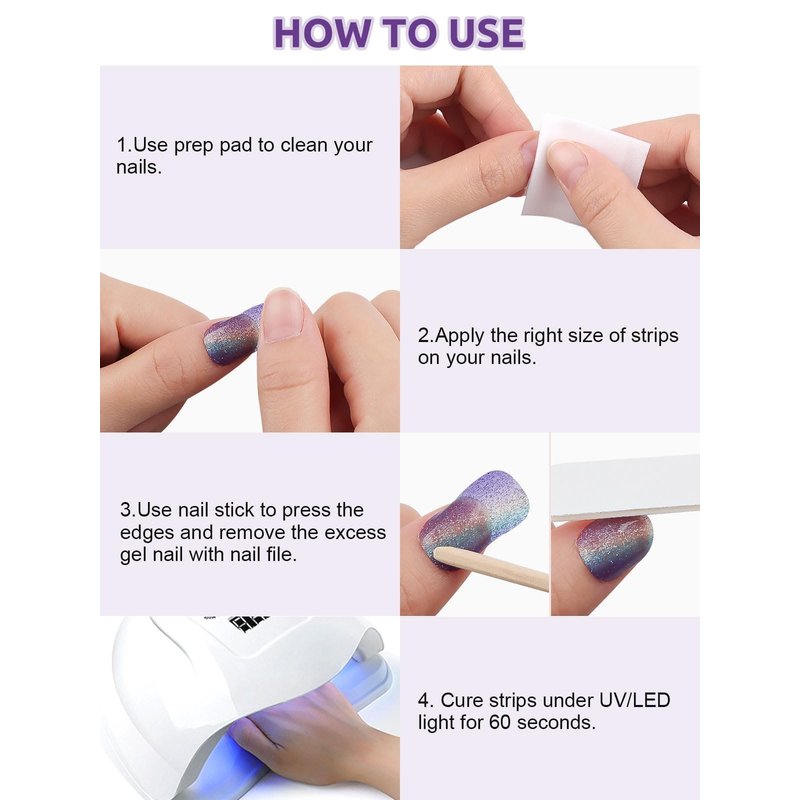 - LED/UV Light Curing: Gel nail wraps can be trimmed into round, square and other shapes you like. Stick on nails, cut off the excess, file down, then cured by UV lamp for 60 seconds. It takes about 15 minutes to complete nail polish choice for nail lovers. Note: If it is not fully cured, the curing time can be extended by 60 seconds.