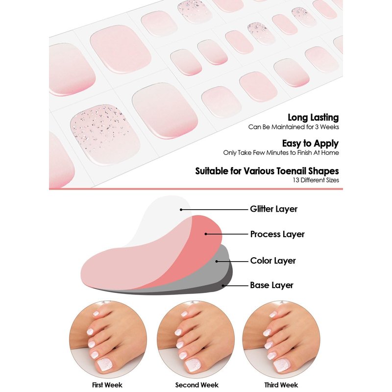 - π Get Stylish Manicure At Home: Toe gel nail stickers are waterproof and long-lasting. You can use a glossy top coat and cured in 60 seconds to extend holding time without long drying time. Using toenail gel strips at home, nails will not become thin due to multiple polishes.