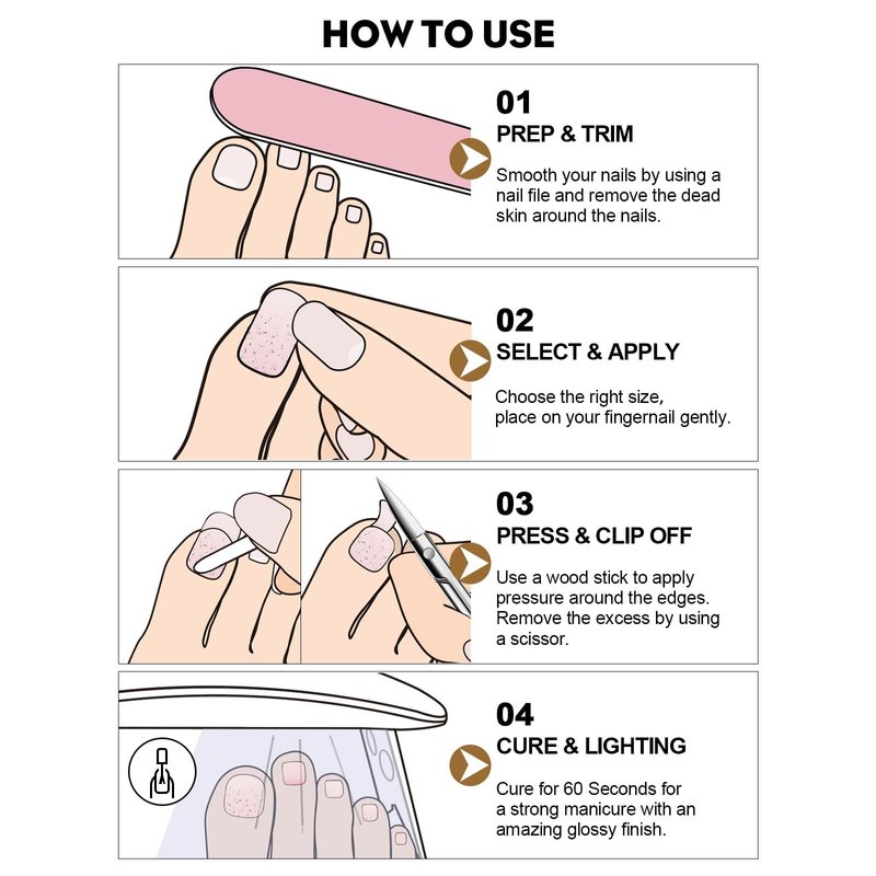 - π Easy to Use/Remove: Itβs more convenient to easily finish a new toe nail polish style in 3 steps, stickup, filing, and light curing. They can last up to 3 weeks when fully cured by UV light. Easy to remove, just peel them off by wood stick. Note: UV/LED lamp Not include in items.