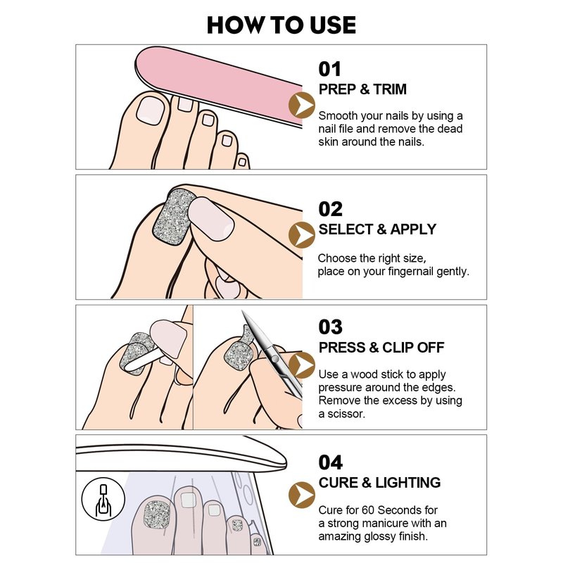 - π Supports Various Nail Shapes: Gel toe nail wraps can be trimmed into a variety of shapes such as round, square and other shapes you like. Stick on nails, cut off the excess, file down, then cured by UV lamp for 60 seconds. It takes about 15 minutes to complete nail polish choice for nail lovers. Note: If it is not fully cured, the curing time can be extended by 60 seconds.