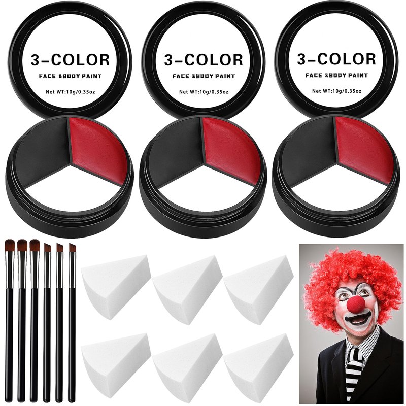 - Package Contains: Considering your needs,we provide you with 3pcs clown face paint,6pcs brush,3pcs triangle powder puff.It will fully meet your needs,so you do not need to be disappointed for the lack of makeup accessories.Brushes outline details and powder puffs complete face makeup .