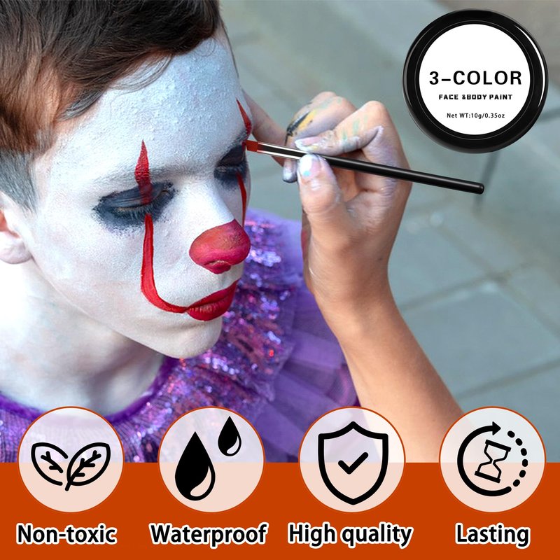 - Widely use: You can use these 3 color face and body paint to dress up as a clown,vampire or witches for any special occasion.Also showing your unique personality in Halloween, Day of the Dead,festival, stage performance, cosplay-themed parties and so on.