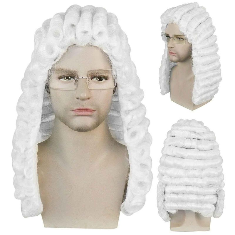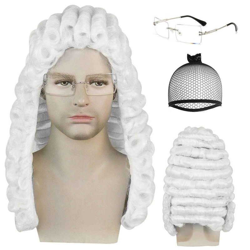 Ebingoo White Judge Wig + Glasses + Wig Cap Judge Colonial Wig Adult Judge Costume Accessories White Lawyer Wig for Men Halloween Party Costume Cosplay