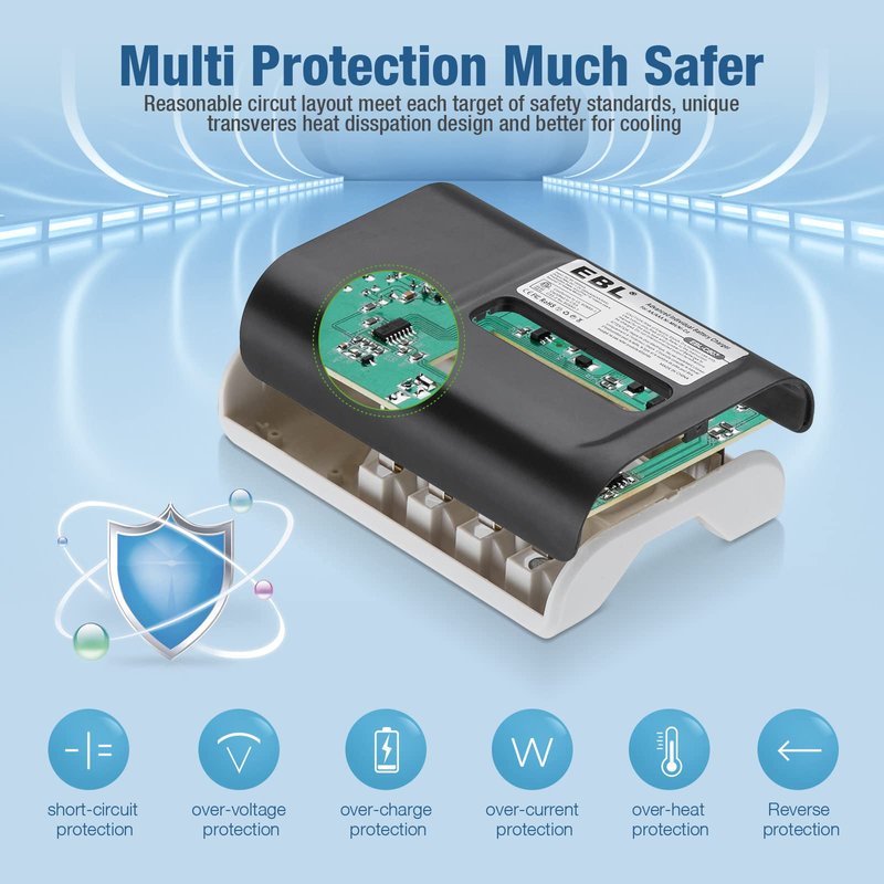 All EBL chargers are up to the standard of Indoor use only,Automatic charge,Environmental,protection,Intelligence protection,Cycle charge, Safety Stabilization and charging indicator.