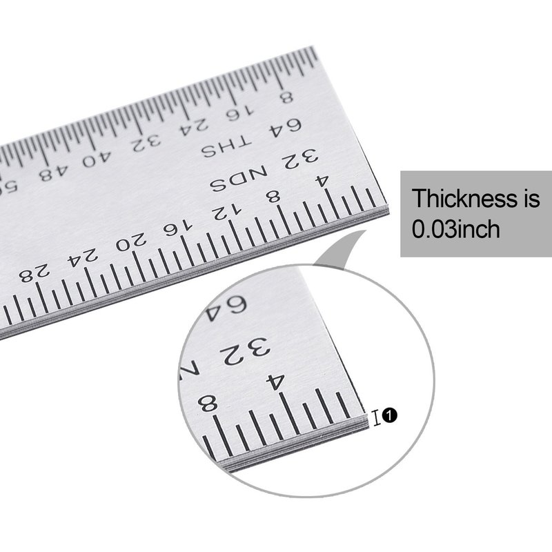 Marked maximum measuring length is up to 6 inches. This precision ruler is made of durable stainless steel for your long lasting use. And the size of this metal ruler is 6 x 0.75 x 0.03 inches.