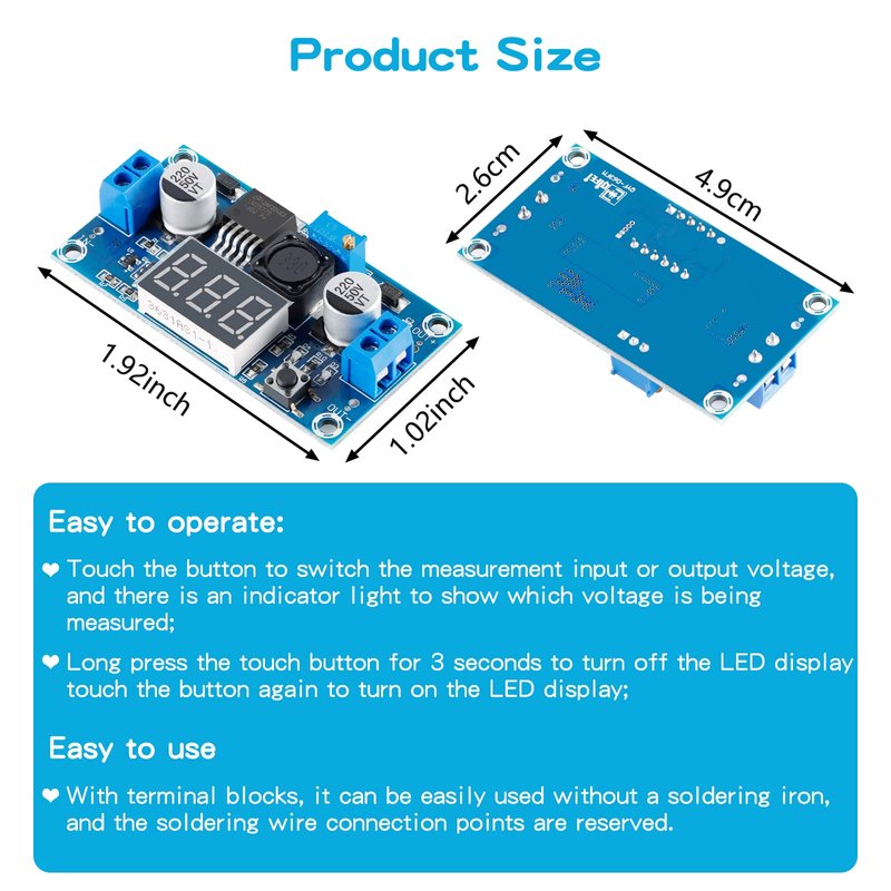 - ★Easy to operate: ♥Touch the button to switch the measurement input or output voltage, and there is an indicator light to show which voltage is being measured; ♥Long press the touch button for 3 seconds to turn off the LED display, touch the button again to turn on the LED display;
