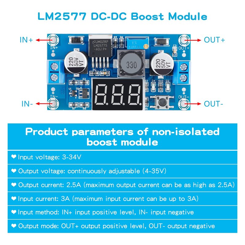 - ★Product parameters of non-isolated boost module: ♥Input voltage: 3-34V ♥Output voltage: continuously adjustable (4-35V) ♥Output current: 2.5A (maximum output current can be as high as 2.5A) ♥Input current: 3A (maximum input current can be up to 3A) ♥Input method: IN+ input positive level, IN- input negative ♥Output mode: OUT+ output positive level, OUT- output negative