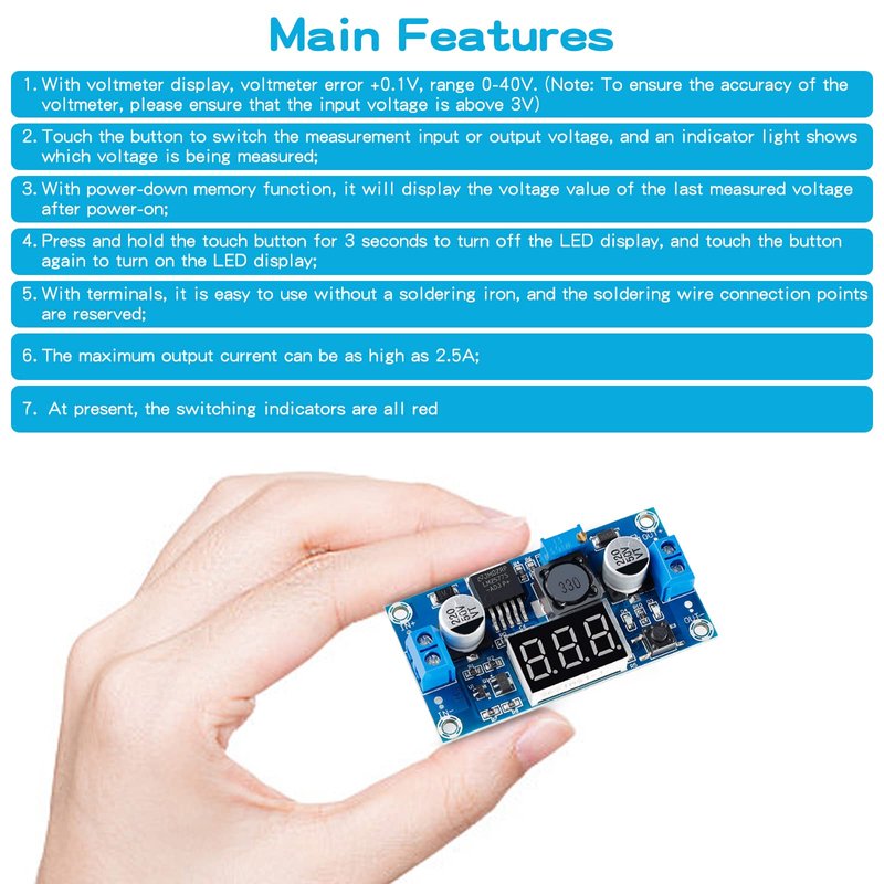 1. With voltmeter display, voltmeter error +0.1V, range 0-40V. (Note: To ensure the accuracy of the voltmeter, please ensure that the input voltage is above 3V)