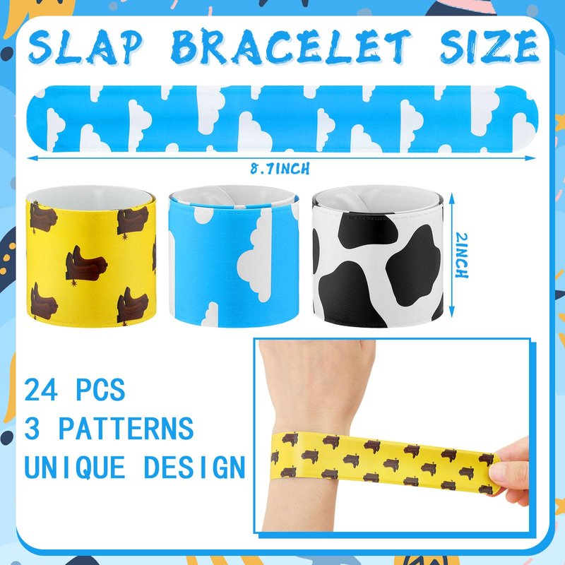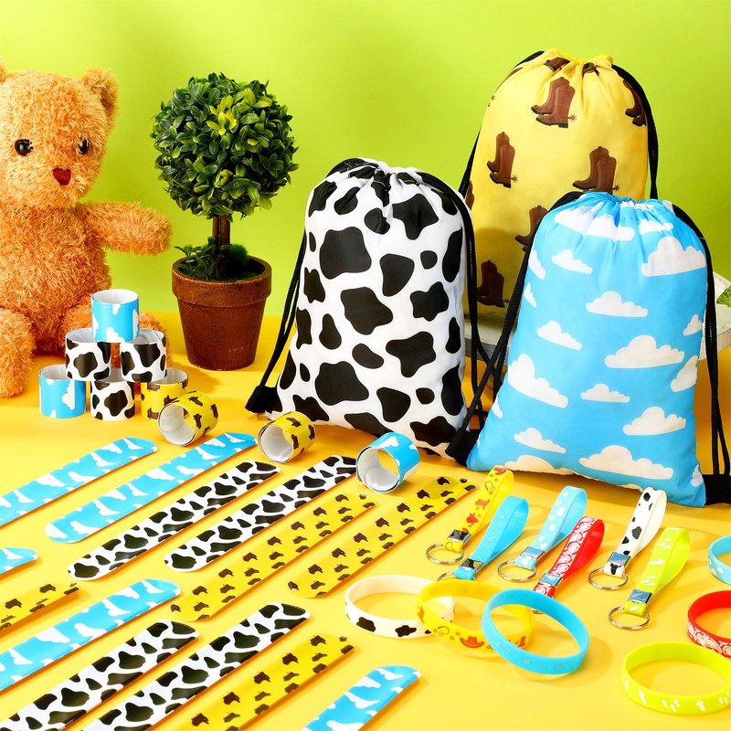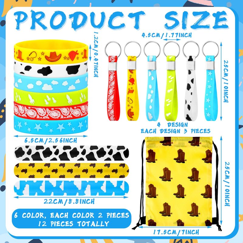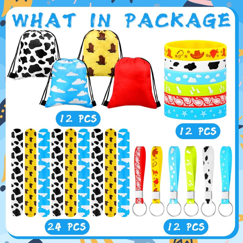 Features: Cartoon story birthday party supplies are ideal for cowboy parties, western themed parties, cartoon story party, country parties, birthday party, etc. They can allow more people to immerse themselves in the joy of the party. Cartoon story theme party decorations have rich and varied designs, printed with blue sky and white clouds, rockets, cowboy hats, cow print, etc., fun and lovely, easily attracting the attention of people.You can regard these western party favors as nice prizes for activities and other fun party games, such as birthday party, fair game prizes, carnival prizes. Specifications: Bracelet material: silicone Keychain material: silicone Drawstring bag material: polyester Color: as the pictures shown Bracelet size: approx. 20.2 x 1.2 x 0.2 cm/ 8 x 0.5 x 0.08 inches Slap bracelet size: about 21.5 x 2.5 cm/ 8.6 x 1 inch Drawstring bag size: approx. 17.5 x 25 cm/ 7 x 10 inches Package includes: 12 x Cartoon story party silicone bracelets 12 x Cartoon story party keychains 12 x Drawstring bags 24 x Cartoon story party slap bracelets Notes: Manual measurement, please allow slight errors in size. The color may exist a slight difference due to different screen displays.
