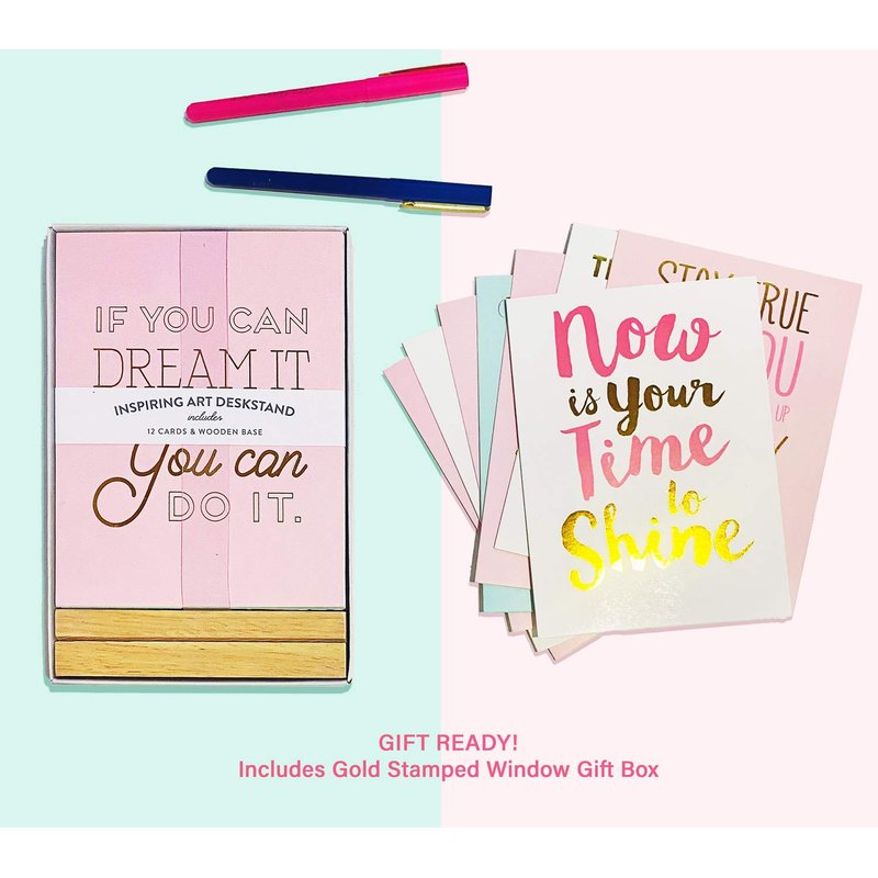 Embrace Color in a Monochrome World with Eccolo Inspiring Art Cards - Uplifting Daily Affirmations for Everyone. Illuminate Your Mood: Let the Eccolo Inspiring Art Cards with Daily Affirmations brighten your spirits instantly. This card set offers a powerful tool for anxiety and stress relief, making each day more enjoyable. These motivational cards also double as cool desk accessories, allowing you to spread positivity with your loved ones. The set includes 12 unique thick cards, each adorned with a beautiful, simplistic, and colorful design, topped with gold-stamped motivational quotes.Display these inspirational note cards with the natural wooden stand, and switch them out monthly, daily, or as often as you like. Their size, 4 7/8 x 6 3/4 inches, and the wooden stand, 5 x 1 x 1.5 inches, make them a perfect fit for your office and rooms. Whenever you're feeling down, take a moment to glance at these motivational stationary cards. Share the love, mindfulness, and empowerment they offer with yourself and others. Thoughtful Gift: Packaged in a beautifully crafted gift box with a window display and gold embossing, this bundle of daily relaxation and positive affirmations is an ideal present for anyone - students, family, or co-workers. Choose Love and Positivity: Face your emotional battles with a positive mental attitude and love. Let these Eccolo Inspiring Art Cards be your guide.