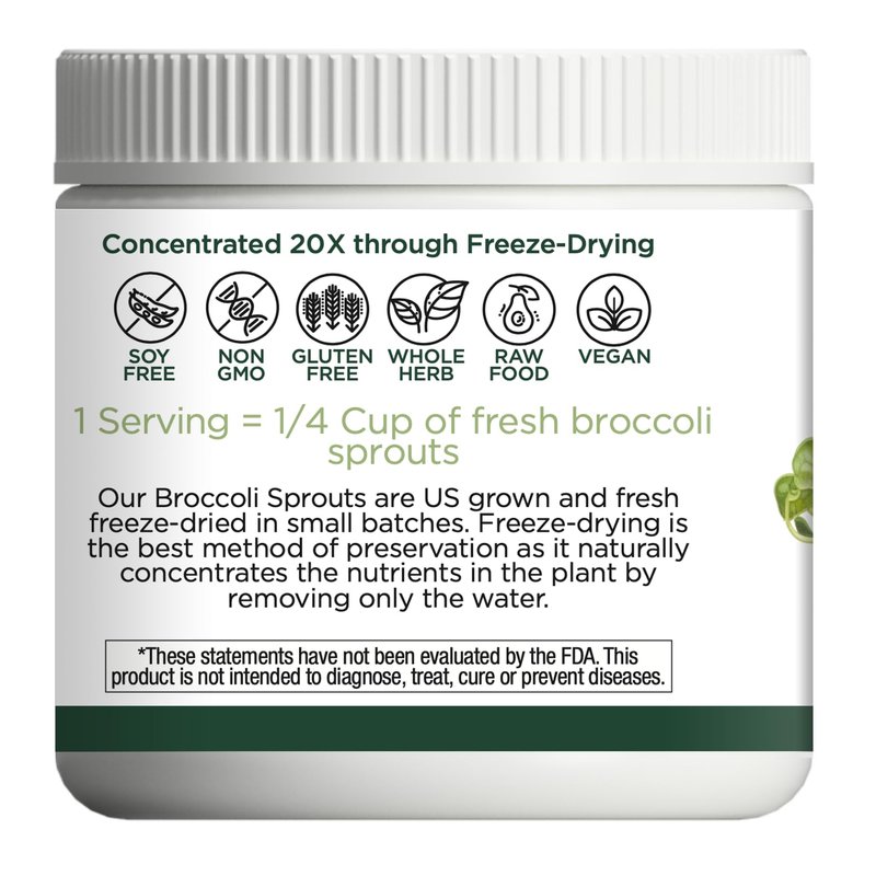 US-grown broccoli sprouts are harvested at peak potency and small batch freeze-dried. Our gentle freeze-drying process ensures that the plants remain whole and raw with all of the nutrition of the fresh plants. Broccoli sprouts support detoxification and are loaded with healthy vitamins and minerals including sulforaphane.