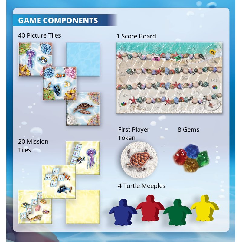 - 🐢 WHILE matching species and completing missions, each player advances his sea turtle towards the water line and to the victory. The abstract gameplay feels like a combination of Dominoes & Chess.