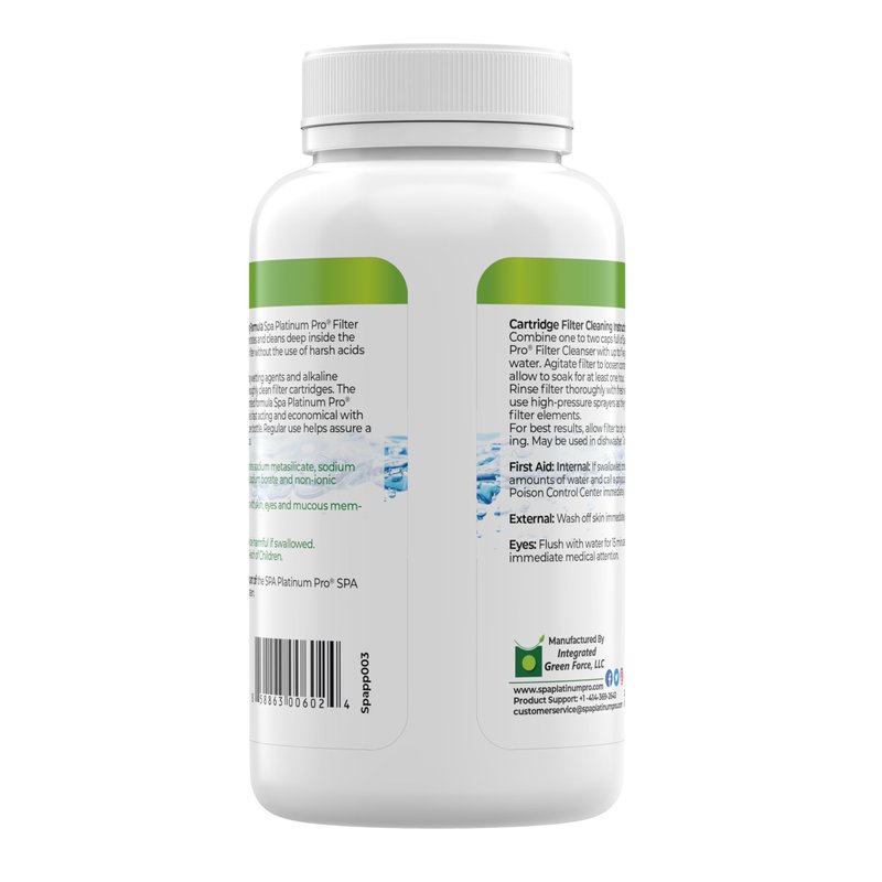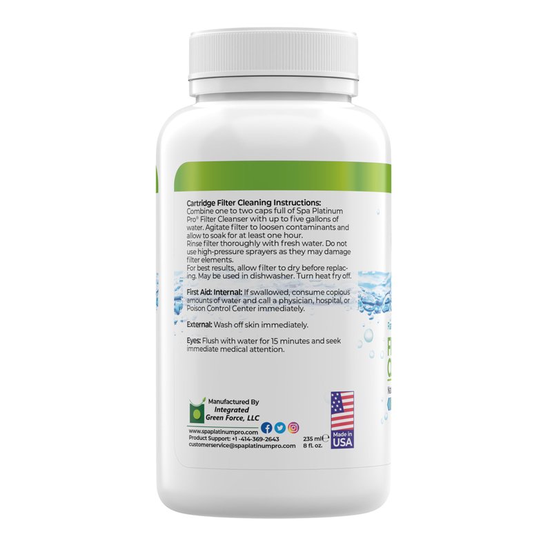 Spa Platinum Pro Filter cleanser Description: It penetrates and cleans deep inside and cleanser the fibers of your filter without the use of harsh acids or chlorine bleach. Our proprietary blend of ingredients will clean your filter cartridges without leaving residue that can cause foaming or alter water chemistry. The ultra-concentrated formula is fast acting and economical - up to 15 uses per bottle. Regular use of Spa platinum Pro FILTERS cleanser will keep your filter squeaky clean for clean, clear spa water. Biodegradable Non toxic No chlorine Fragrance and dye free Phosphate Free and chlorine free No VOCs or petrochemicals Made from all natural raw ingredients Made with pride in the USA Specifications: Fragrance: Fragrance Free Size: 8 Fl Oz/235g