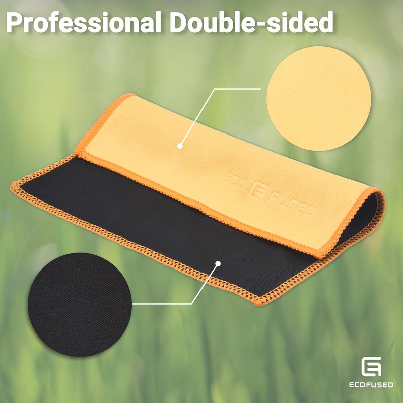 Eco-Fused Microfiber Cleaning Cloths - 5 Pack- Double-sided These cloths combine suede on one side and soft microfiber on the other. Both sides can be used to clean a range of delicate surfaces including cell phones, laptops, tablets, LCD TV screens, glasses, and watches. They can be used dry or with your choice of cleaning fluids. We use high quality microfiber to make our cloths. The millions of tiny fibers in the cloths gently lift away dirt and grime from any delicate surface leaving no marks or scratches. The size of the microfiber cleaning cloths are also ideal to clean delicate surfaces, such as mirrors, glass tables, ceramics, etc.. Whether it be cleaning display cabinets at home or wiping office desktop screens, these cloths are handy and will leave the surface lint-free. The durable material can withstand frequent use. Hand washing is the best way to clean these cloths. You can use cool or warm (not hot) water alone or with a mild detergent and then let them air-dry. Please do not iron, bleach or use fabric softener. Contents: 5x Suede and Microfiber Cleaning Cloths
