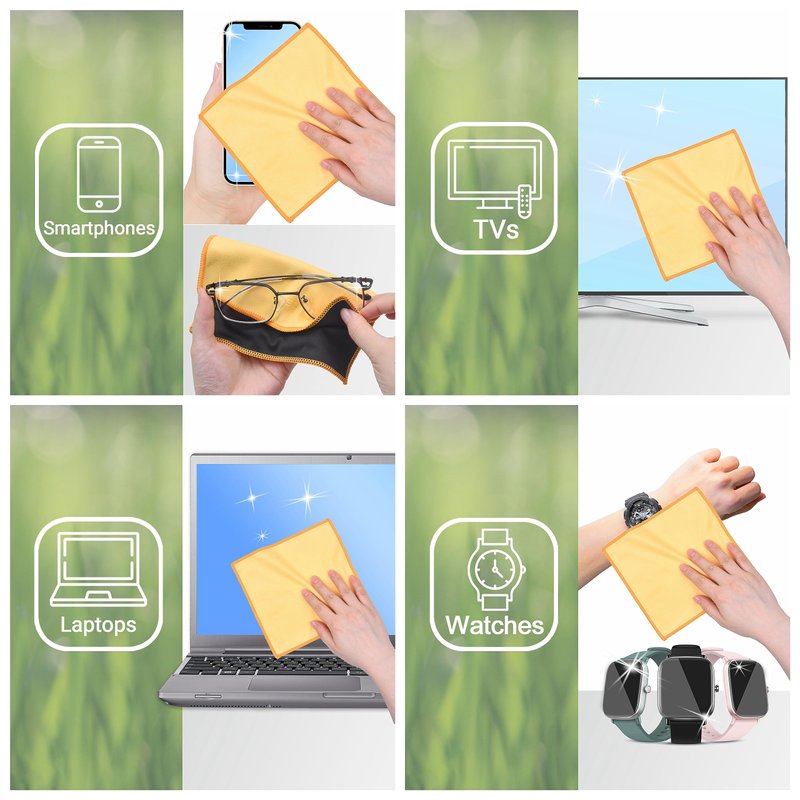 - Ideal Size: The size is good enough to clean TV screens, computer monitors and LCD screens. Each microfiber cleaning cloth can be used to quickly remove fingerprints, dust and smudges from the screen of your phone, tablet, TV, notebook , glasses, camera lenses, smartphones and more.