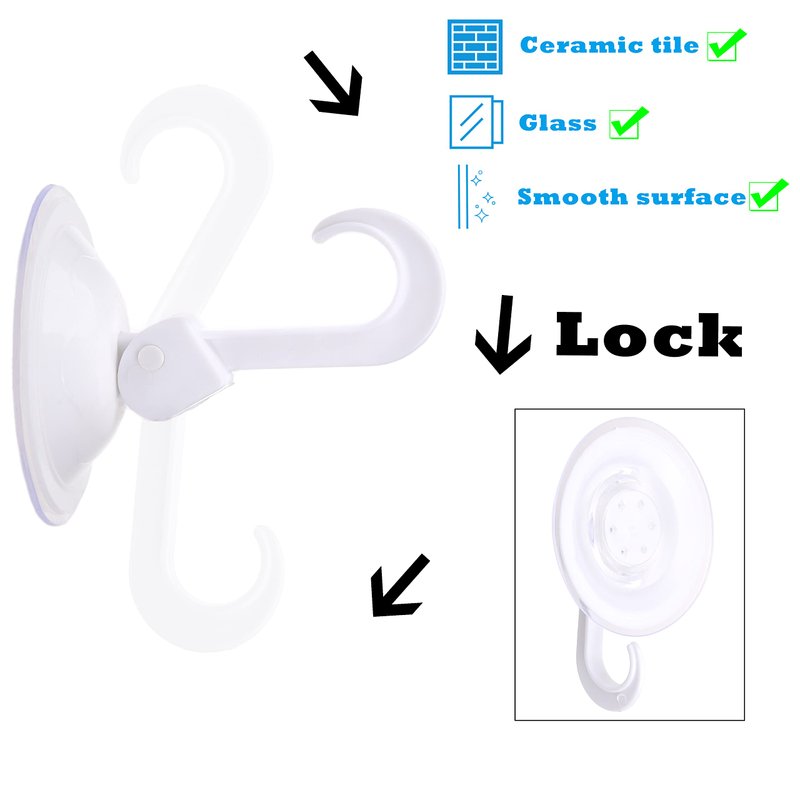 - 4X HIGH-QUALITY VACUUM WALL HOOKS ⭆ Durable, temperature resistant and has great suction power, the suction cup hooks are made with silica gel and ABS material. These white suction cup hooks stick to clean flat surfaces such as glass windows, smooth tile walls, fiberglass shower walls, bathroom mirrors and more.