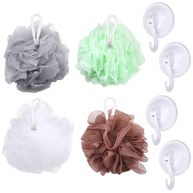 - BATH SPONGES/ SUCTION HOOKS SET ⭆ The pack includes shower bath loofahs and suction cup wall mounts. Create a thick rich lather with the shower bath loofah and enjoy your bath experience. Hang the loofah on a suction cup hook for convenience. The suction cup holds well even if you hand a wet loofah.