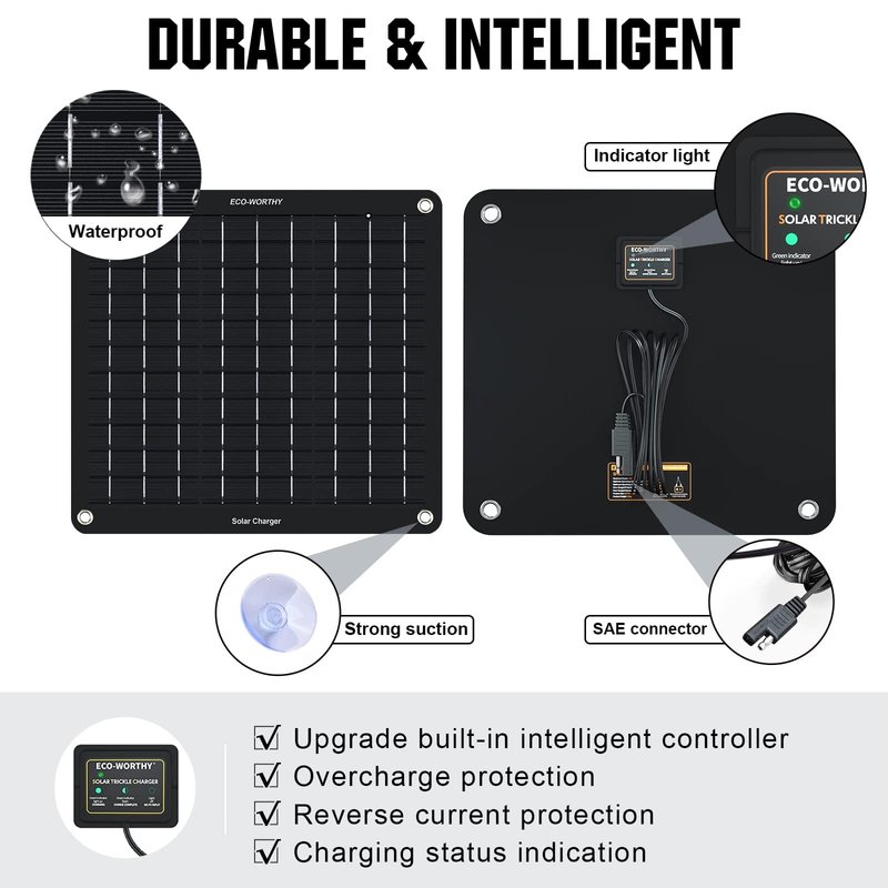 - 💦【Function】Suitable for keeping vehicles/boat battery charged during the weeks unused. No need to disconnect the battery or have someone start the vehicle periodically. The indicator light on the back can observe the charging state. And it’s waterproof, you can safely use it outdoors(After experimental test).