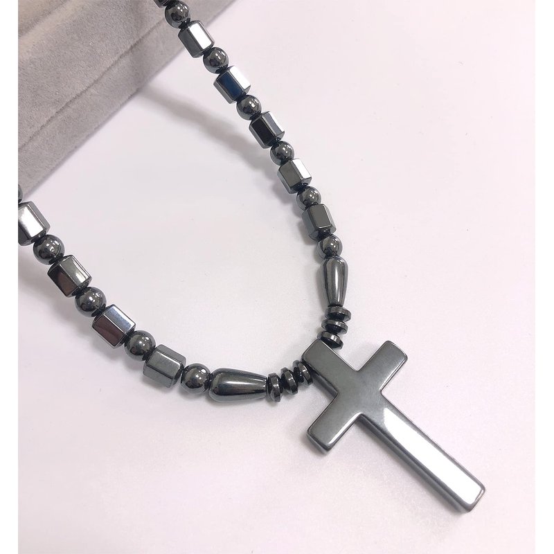 Ecooon Cross pendant hematite magnetic therapy necklace for men and women, healing stone jewelry unisex 22" length