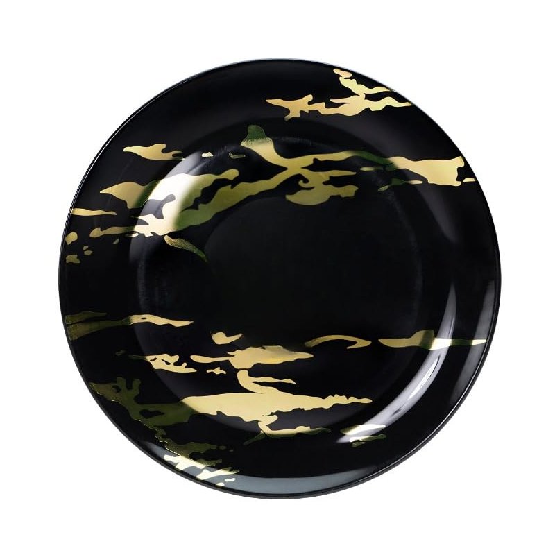 - Bold Black and Gold Marble Design for Modern Elegance – This 8 inch Black Plastic Round Salad Plate with Gold Marble Design features a rich black background adorned with elegant gold veining, delivering a sleek and luxurious aesthetic. Its eye catching design enhances any table setting, making it ideal for high end weddings, black tie events, and luxury dinner parties.